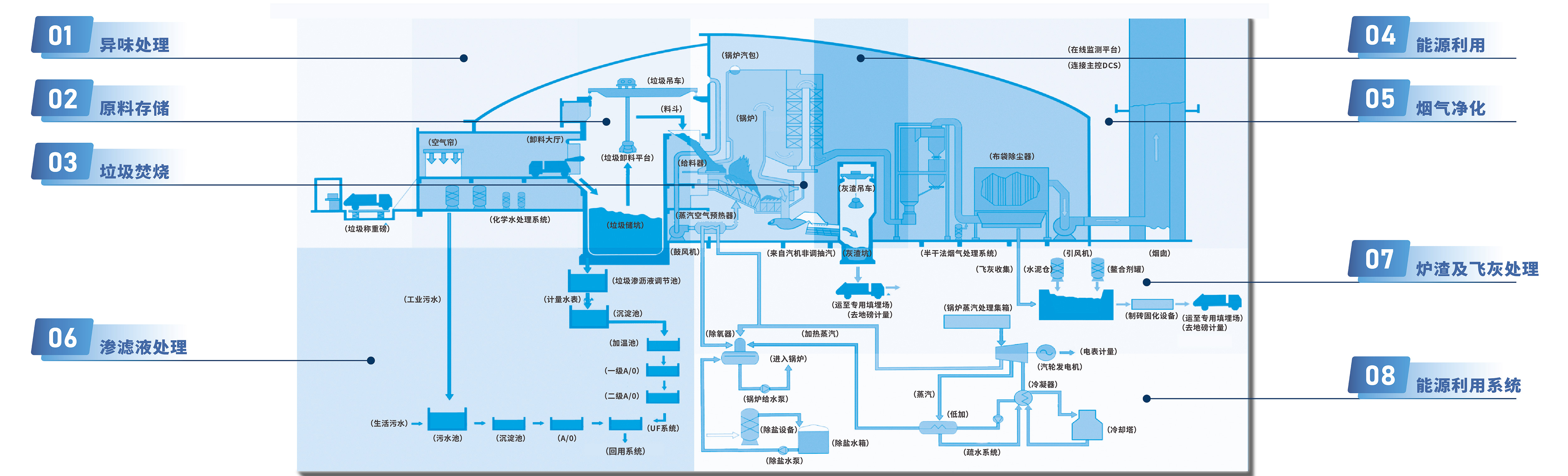 盈峰環境生活垃圾焚燒發電處理模式將全流程劃分為八大模塊,構建囊括垃圾入庫、儲存、焚燒,煙氣凈化、滲濾液處理、爐渣及飛灰處理、熱能產生、能源利用的八大系統。
